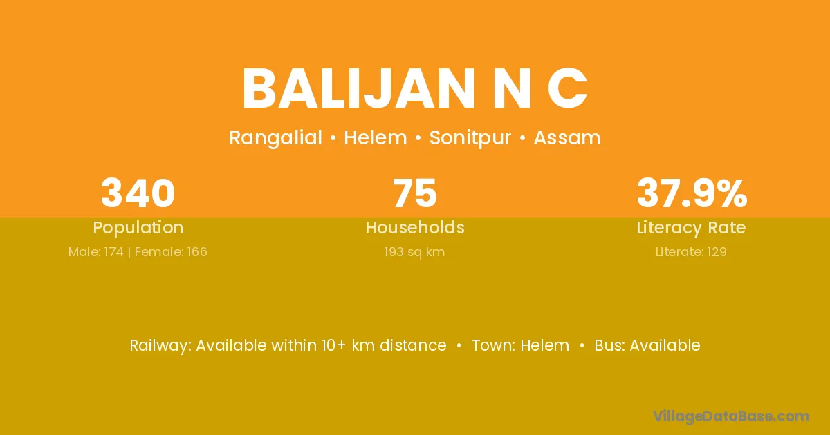 Balijan N C village has a total population of 340 people, of which 174 are males and 166 are females.