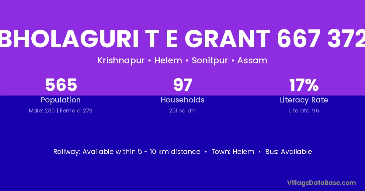 Bholaguri T E Grant 667 372 village has a total population of 565 people, of which 286 are males and 279 are females.