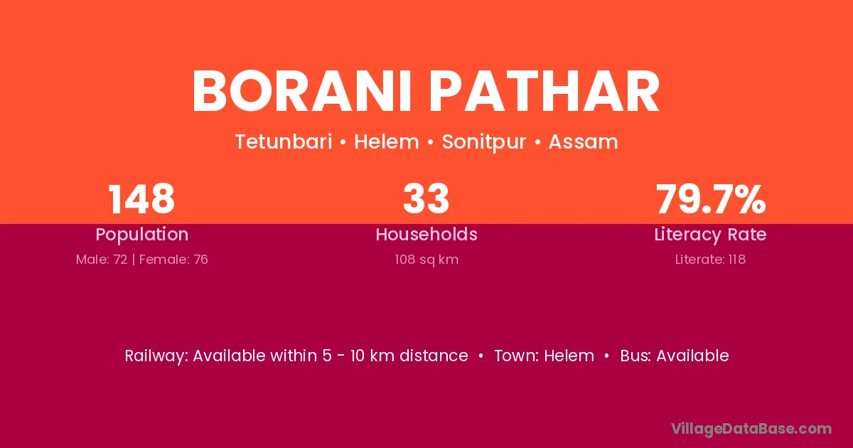 Borani Pathar village has a total population of 148 people, of which 72 are males and 76 are females.