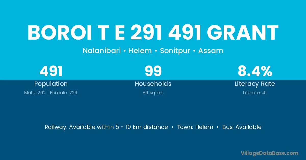 The literacy rate of Boroi T E 291 491 Grant village is 8.35%. Male literacy stands at 10.69% and female literacy at 5.68%.