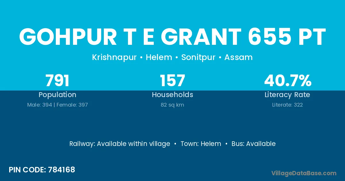 Gohpur T E Grant 655 Pt village has a total population of 791 people, of which 394 are males and 397 are females.