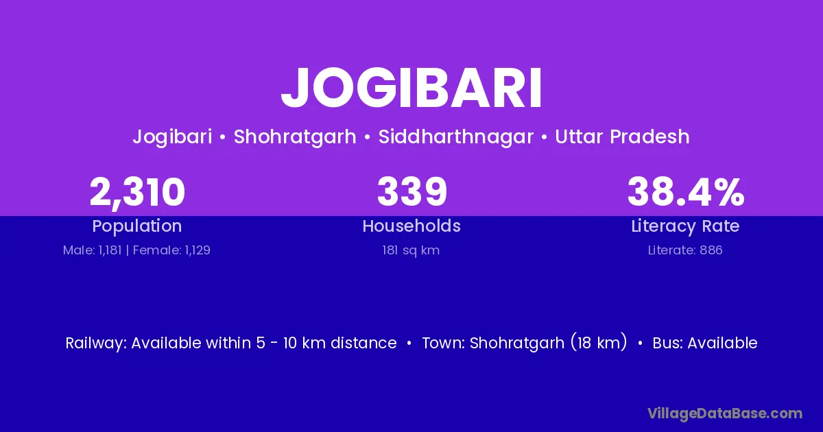 The literacy rate of Jogibari village is 55.91%. Male literacy stands at 62.09% and female literacy at 49.72%.