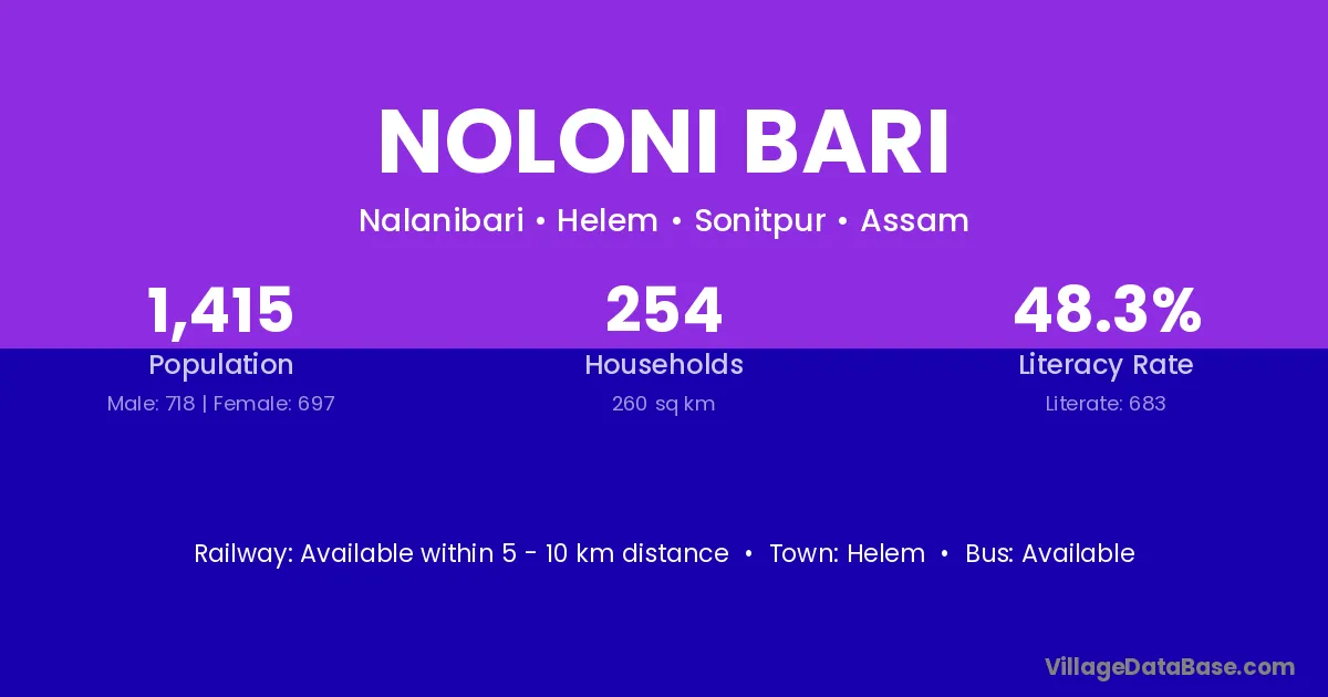 Noloni Bari village has a total population of 1,415 people, of which 718 are males and 697 are females.