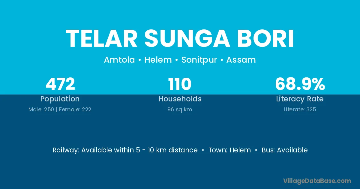 Telar Sunga Bori village has a total population of 472 people, of which 250 are males and 222 are females.