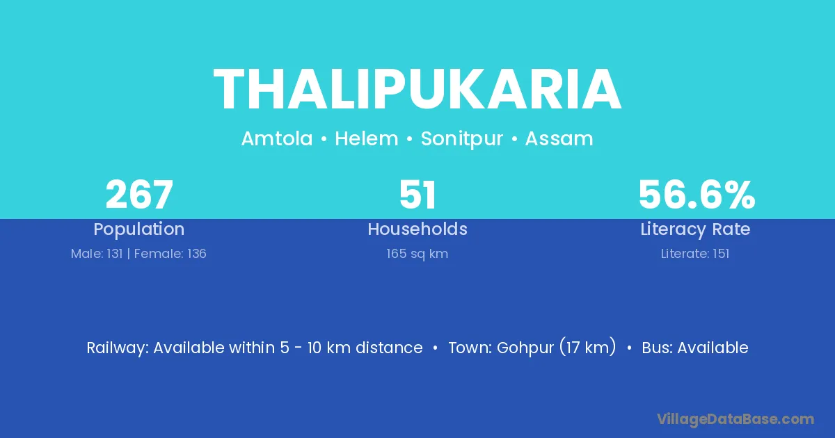 Gohpur (17 km) is the nearest town to Thalipukaria village for major economic activities and is located approximately 17 km away.