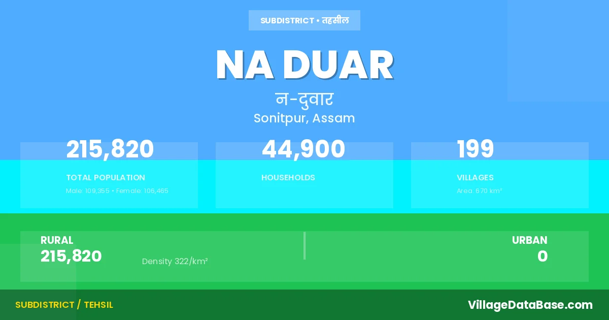 Na Duar is a town and Subdivision in the Sonitpur district of the Assam. In India, a Subdivision is a subdivision of a district responsible for the administration and revenue collection of a specific area within the district. Subdivisions play a crucial role in the local governance structure, contributing significantly to the development and administration of their communities.