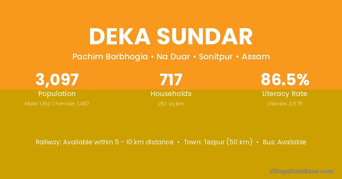 Tezpur (50 km) is the nearest town to Deka Sundar village for major economic activities and is located approximately 50 km away.