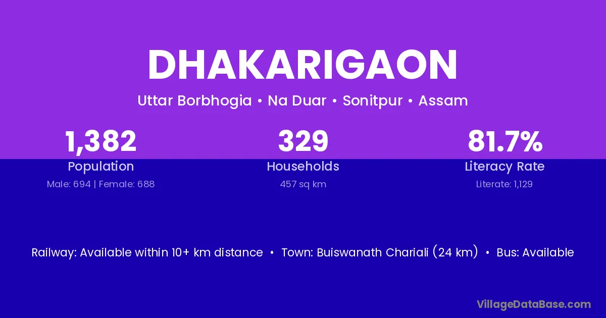 Buiswanath Chariali (24 km) is the nearest town to Dhakarigaon village for major economic activities and is located approximately 24 km away.