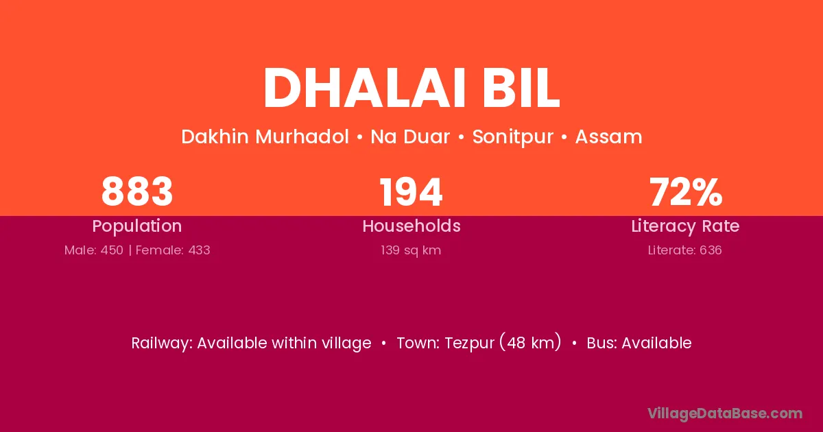 Tezpur (48 km) is the nearest town to Dhalai Bil village for major economic activities and is located approximately 48 km away.