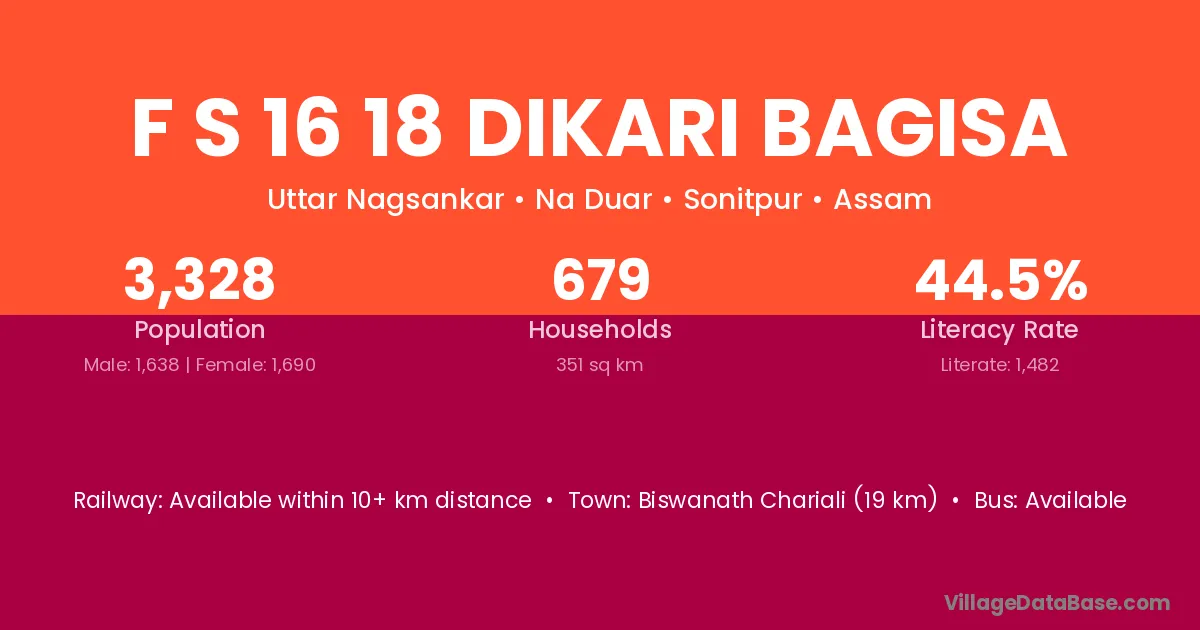 Biswanath Chariali (19 km) is the nearest town to F S 16 18 Dikari Bagisa village for major economic activities and is located approximately 19 km away.