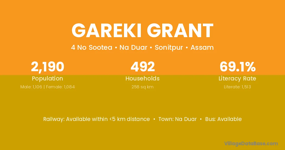 Gareki Grant village has a total population of 2,190 people, of which 1,106 are males and 1,084 are females.