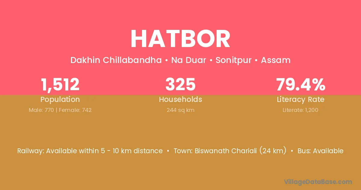 Biswanath Chariali (24 km) is the nearest town to Hatbor village for major economic activities and is located approximately 24 km away.