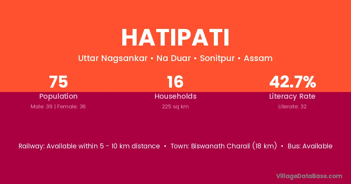 Biswanath Charali (18 km) is the nearest town to Hatipati village for major economic activities and is located approximately 18 km away.