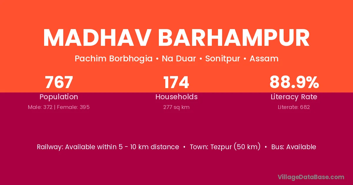 Tezpur (50 km) is the nearest town to Madhav Barhampur village for major economic activities and is located approximately 50 km away.