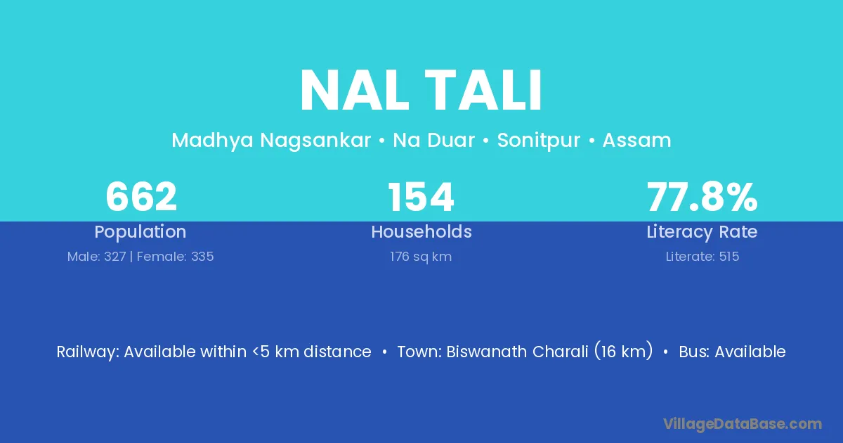 Biswanath Charali (16 km) is the nearest town to Nal Tali village for major economic activities and is located approximately 16 km away.