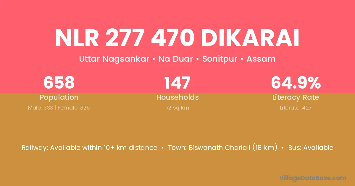 Biswanath Chariali (18 km) is the nearest town to Nlr 277 470 Dikarai village for major economic activities and is located approximately 18 km away.