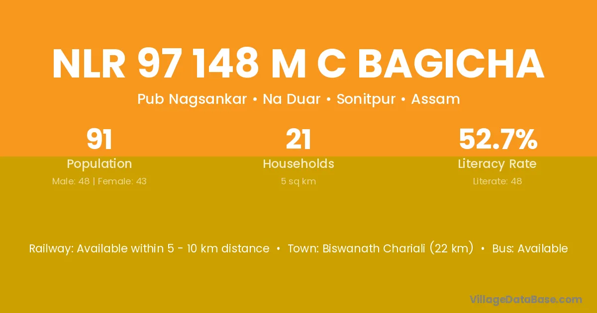 Biswanath Chariali (22 km) is the nearest town to Nlr 97 148 M C Bagicha village for major economic activities and is located approximately 22 km away.