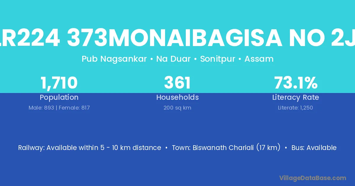 Biswanath Chariali (17 km) is the nearest town to Nlr224 373monaibagisa No 2jai village for major economic activities and is located approximately 17 km away.