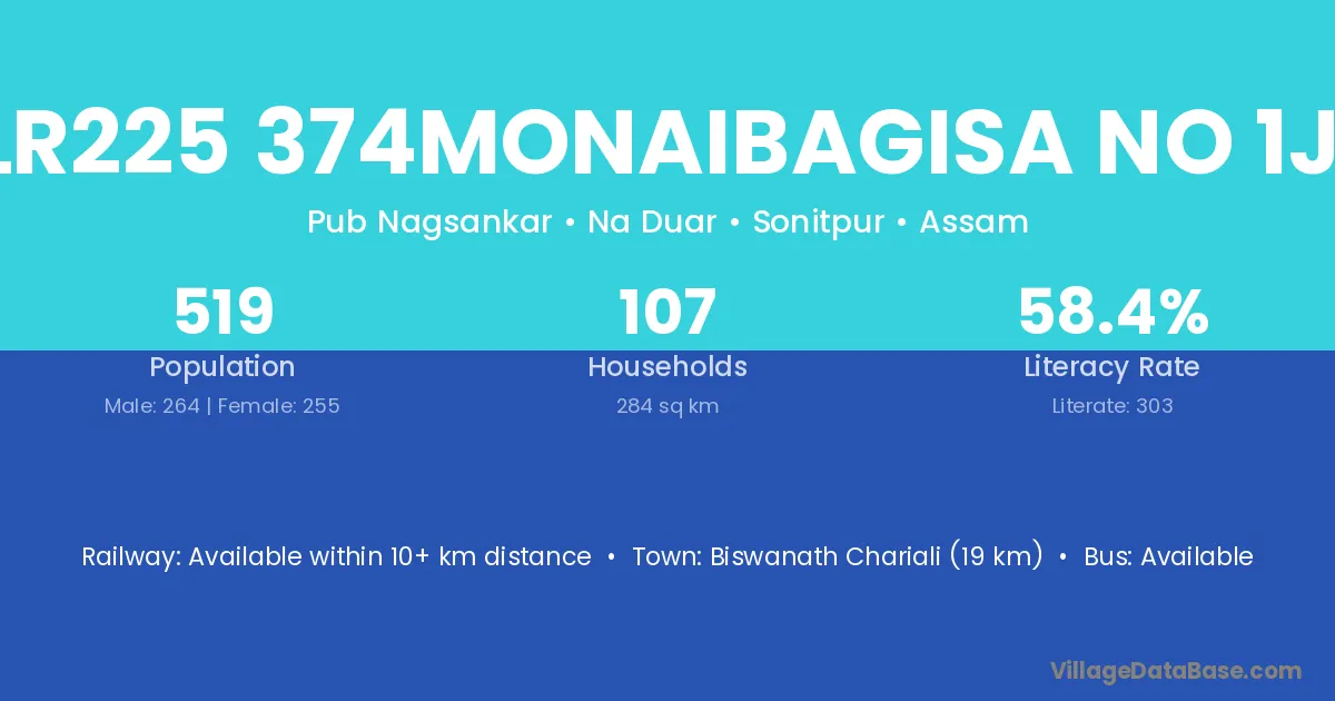 Biswanath Chariali (19 km) is the nearest town to Nlr225 374monaibagisa No 1jai village for major economic activities and is located approximately 19 km away.