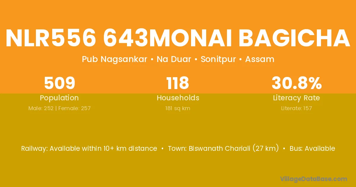 Biswanath Chariali (27 km) is the nearest town to Nlr556 643monai Bagicha village for major economic activities and is located approximately 27 km away.