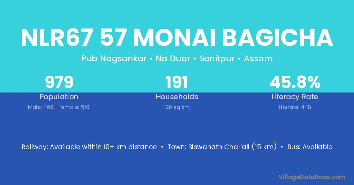 Biswanath Chariali (15 km) is the nearest town to Nlr67 57 Monai Bagicha village for major economic activities and is located approximately 15 km away.