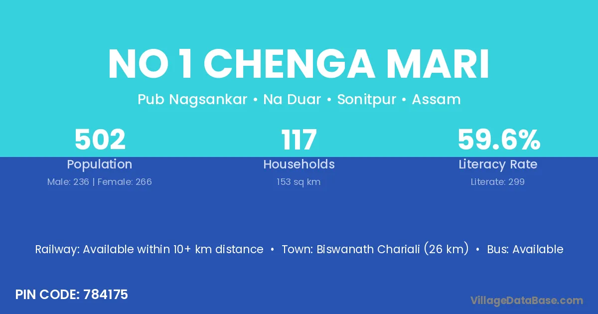 Biswanath Chariali (26 km) is the nearest town to No 1 Chenga Mari village for major economic activities and is located approximately 26 km away.