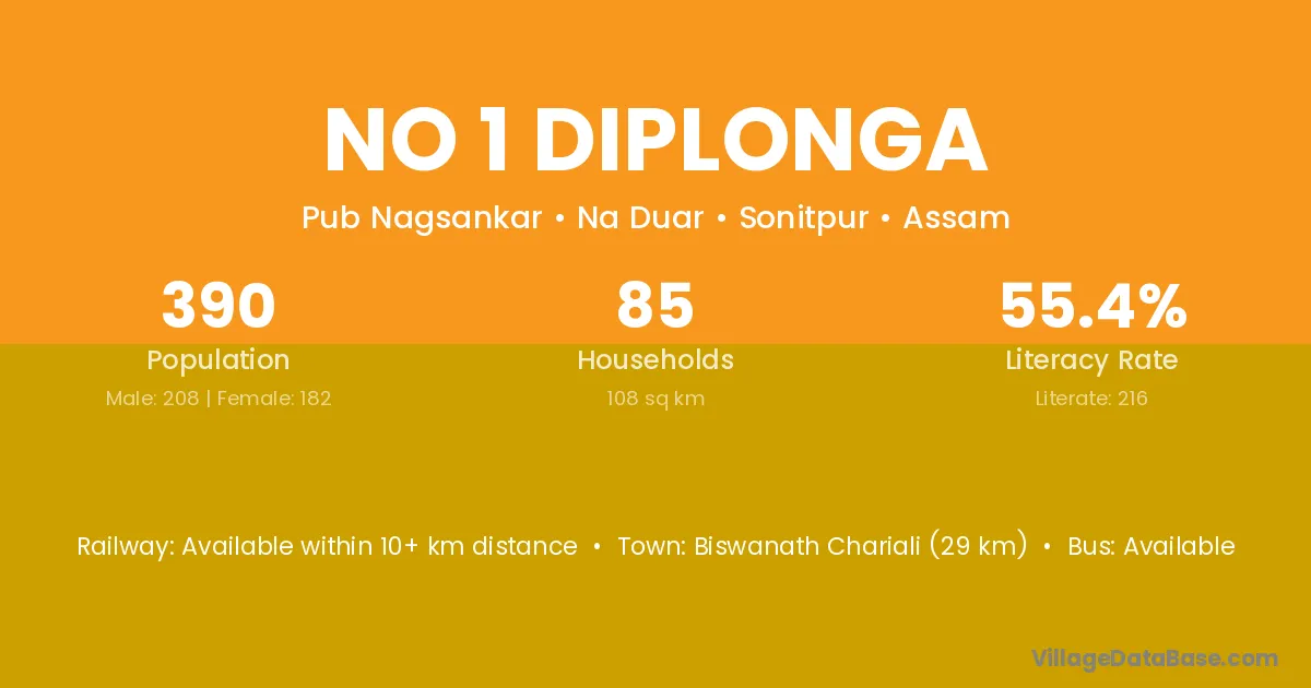 Biswanath Chariali (29 km) is the nearest town to No 1 Diplonga village for major economic activities and is located approximately 29 km away.