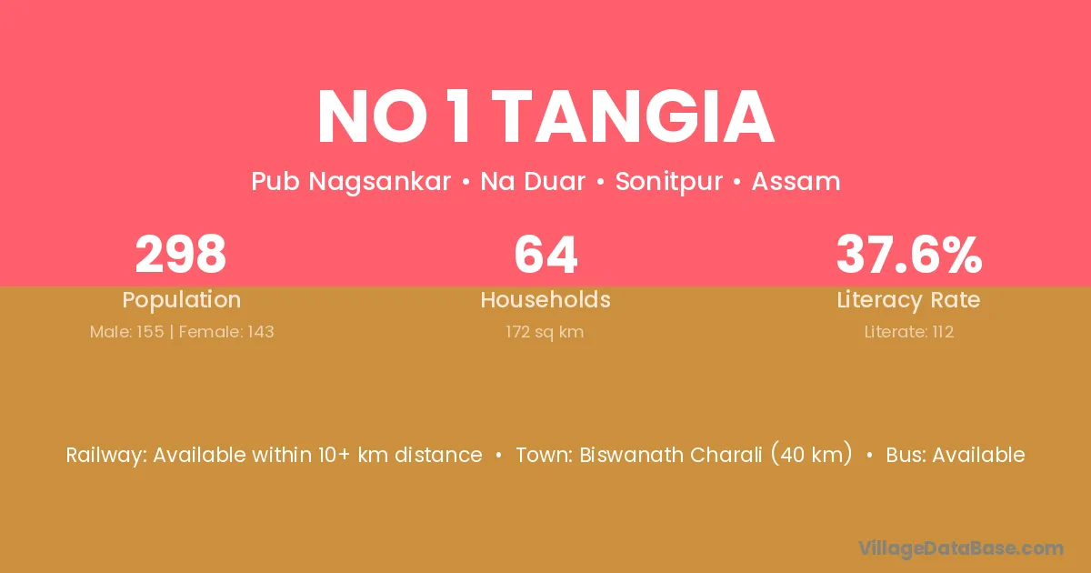 Biswanath Charali (40 km) is the nearest town to No 1 Tangia village for major economic activities and is located approximately 40 km away.