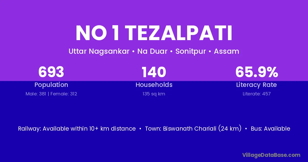 No 1 Tezalpati village has a total population of 693 people, of which 381 are males and 312 are females.