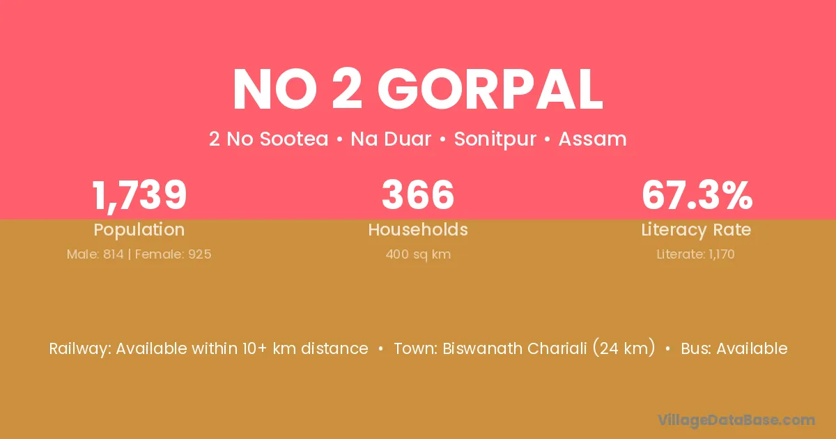 Biswanath Chariali (24 km) is the nearest town to No 2 Gorpal village for major economic activities and is located approximately 24 km away.