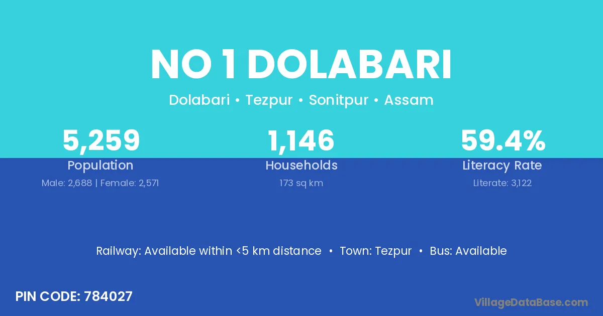 No 1 Dolabari village has a total population of 5,259 people, of which 2,688 are males and 2,571 are females.
