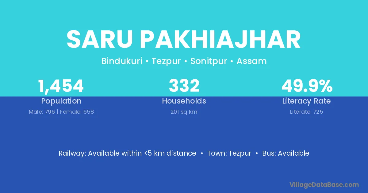 Saru Pakhiajhar village has a total population of 1,454 people, of which 796 are males and 658 are females.