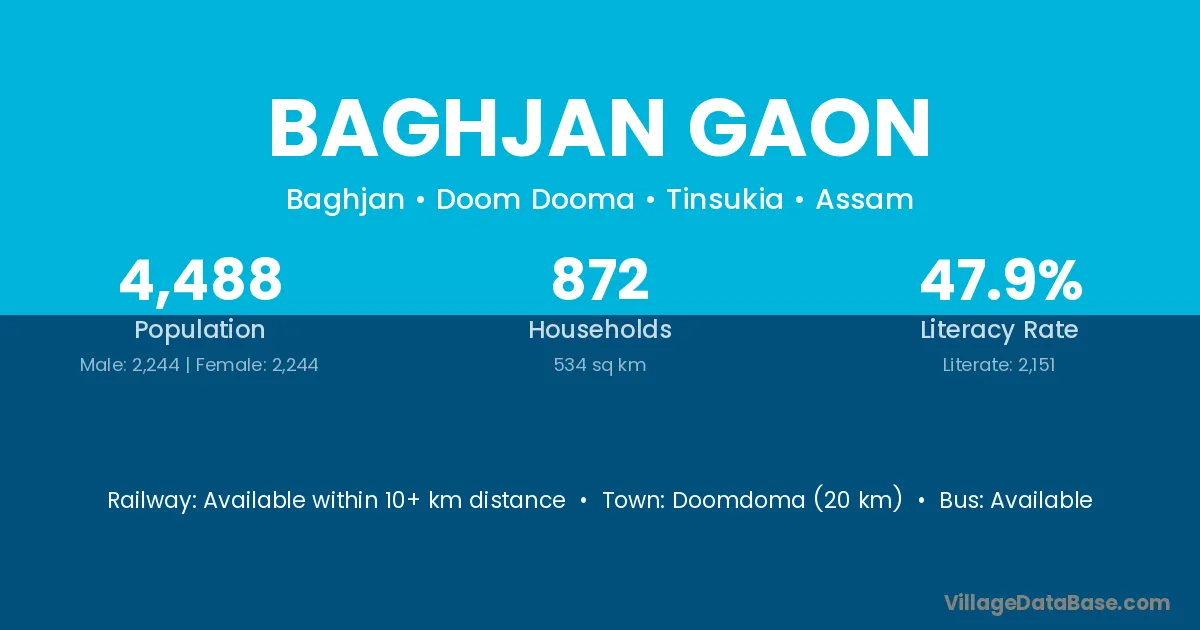 Doomdoma (20 km) is the nearest town to Baghjan Gaon village for major economic activities and is located approximately 20 km away.
