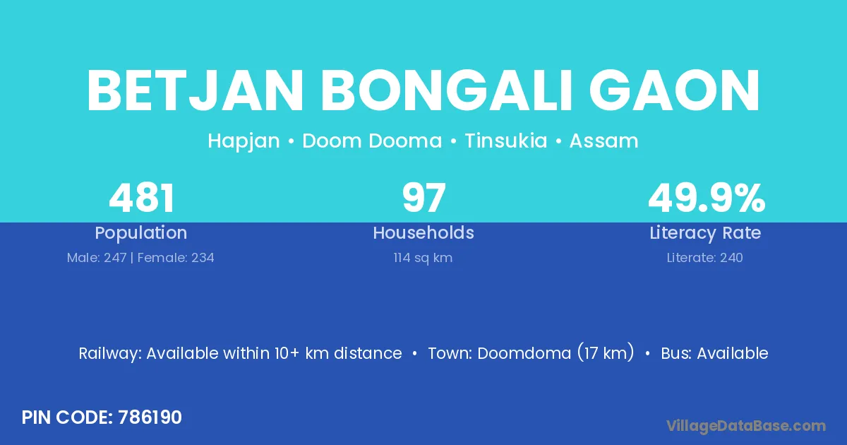 Betjan Bongali Gaon village has a total population of 481 people, of which 247 are males and 234 are females.