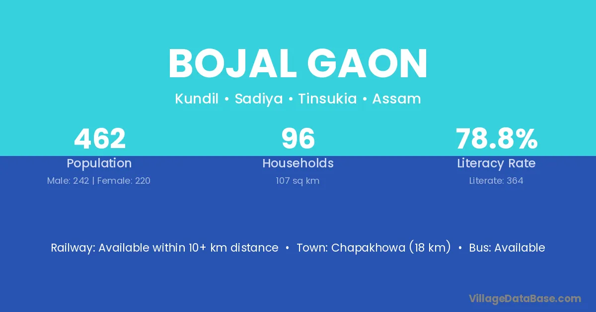 Doomdoma (16 km) is the nearest town to Bojal Gaon village for major economic activities and is located approximately 16 km away.