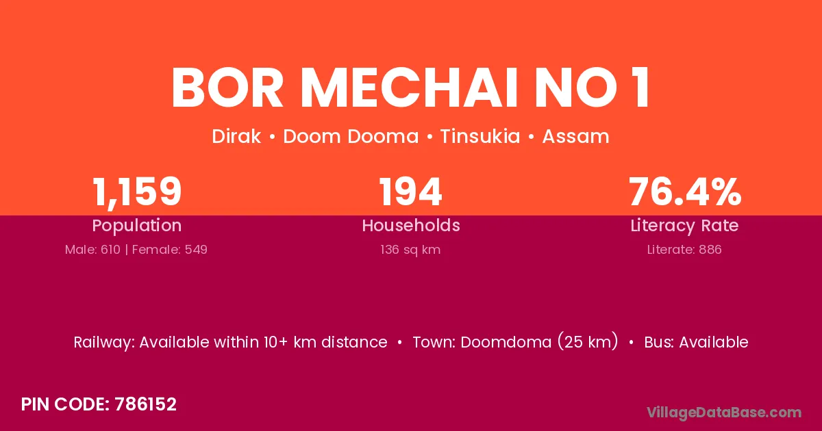 Doomdoma (25 km) is the nearest town to Bor Mechai No 1 village for major economic activities and is located approximately 25 km away.