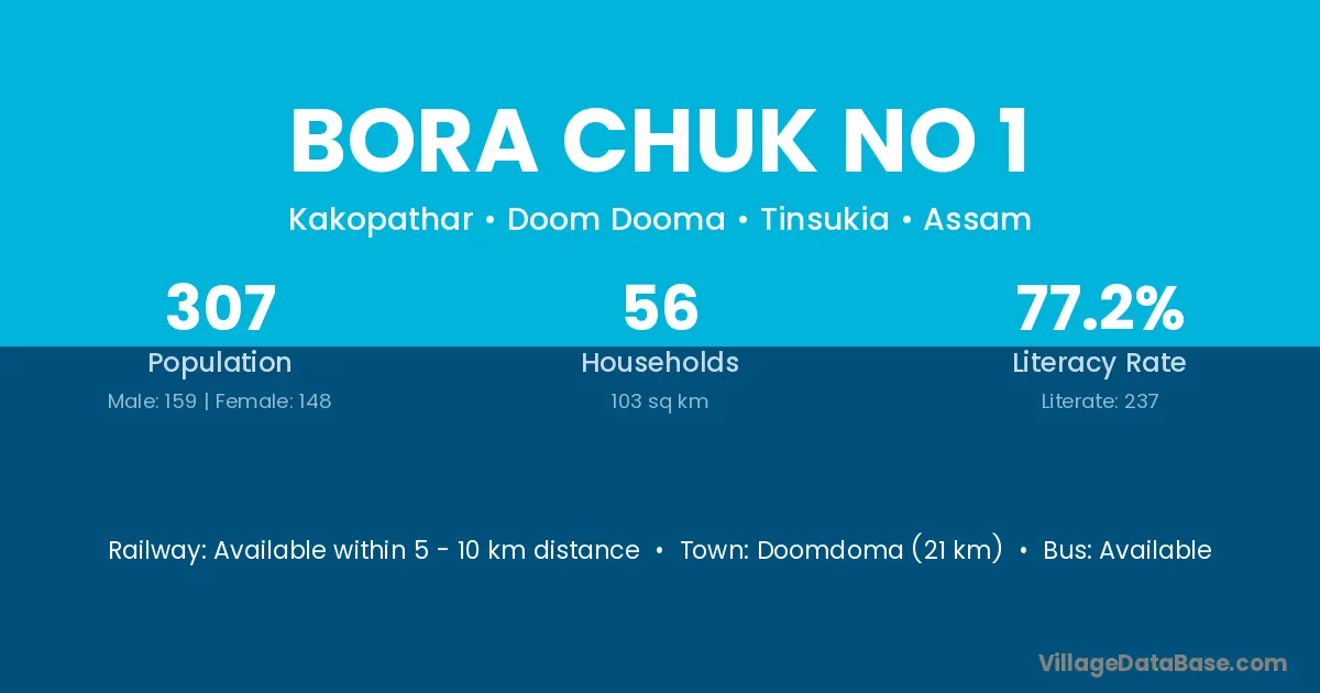 Doomdoma (21 km) is the nearest town to Bora Chuk No 1 village for major economic activities and is located approximately 21 km away.