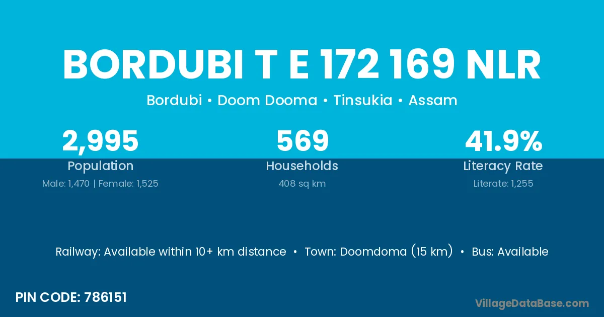 Bordubi T E 172 169 Nlr village has a total population of 2,995 people, of which 1,470 are males and 1,525 are females.