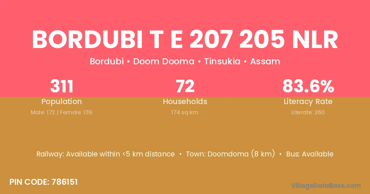 According to Census 2011 information, the village code of Bordubi T E 207 205 Nlr village is 786151.