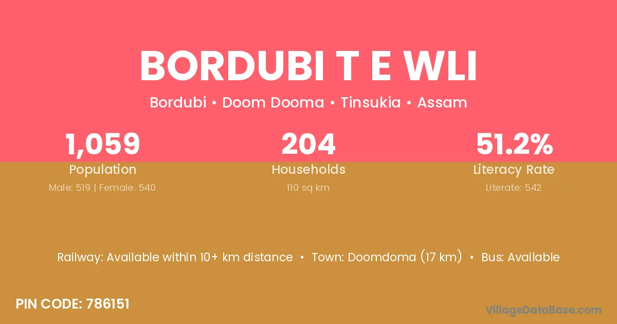 According to Census 2011 information, the village code of Bordubi T E Wli village is 786151.