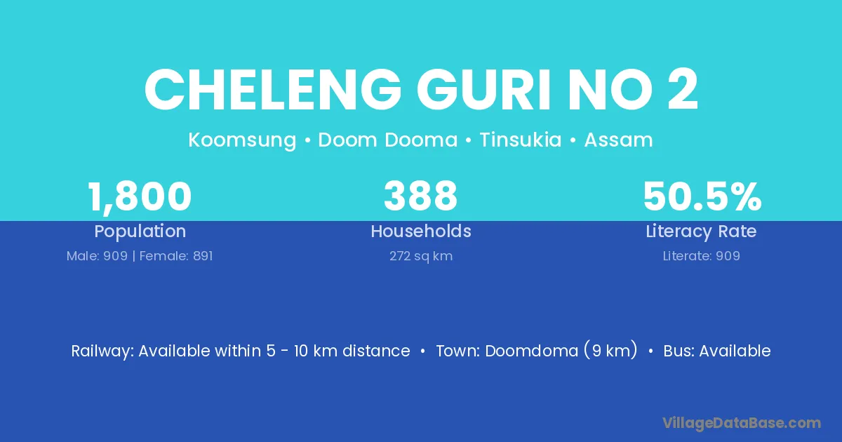 Doomdoma (9 km) is the nearest town to Cheleng Guri No 2 village for major economic activities and is located approximately 9 km away.