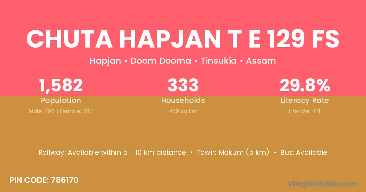 Makum (5 km) is the nearest town to Chuta Hapjan T E 129 Fs village for major economic activities and is located approximately 5 km away.