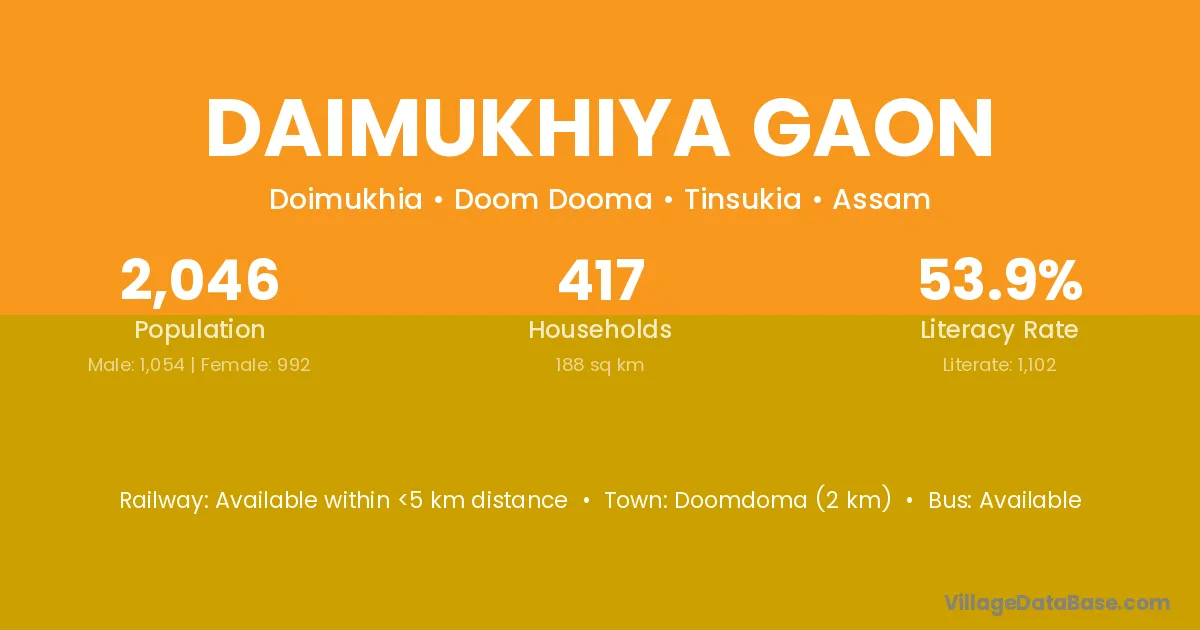 Doomdoma (2 km) is the nearest town to Daimukhiya Gaon village for major economic activities and is located approximately 2 km away.