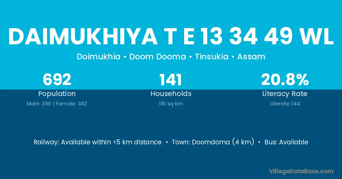Doomdoma (4 km) is the nearest town to Daimukhiya T E 13 34 49 Wl village for major economic activities and is located approximately 4 km away.