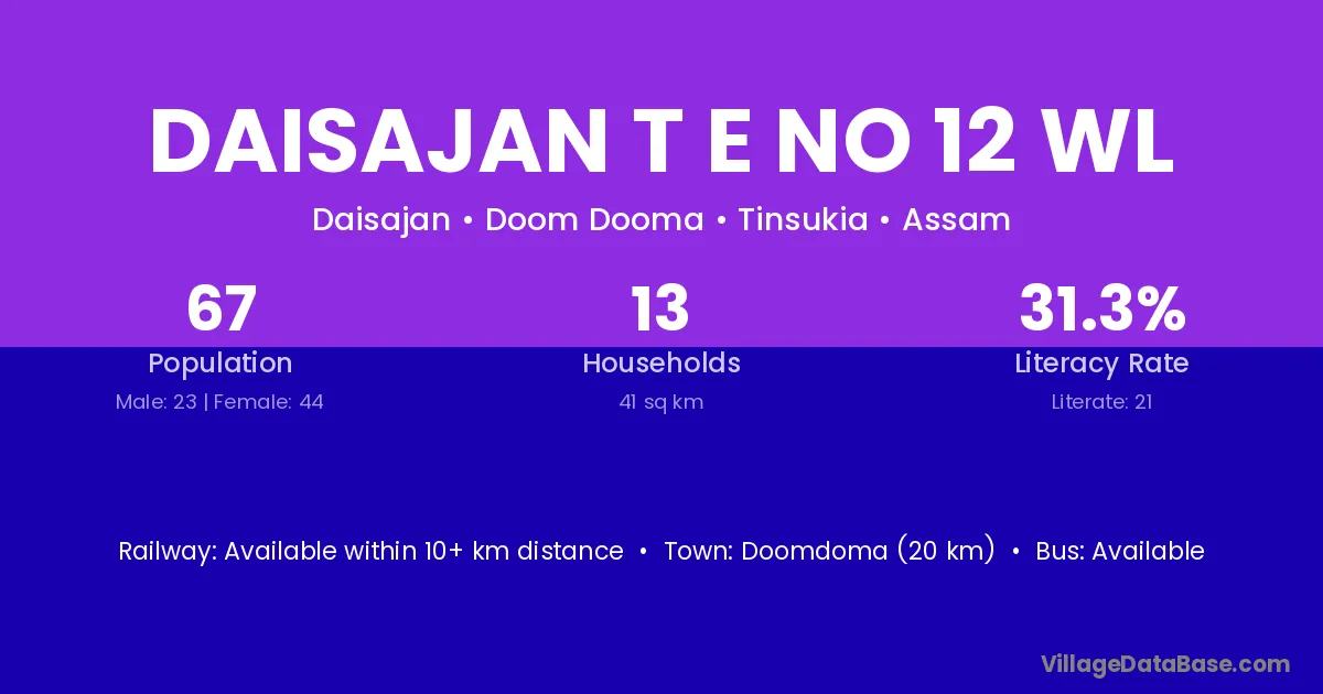 The literacy rate of Daisajan T E No 12 Wl village is 31.34%. Male literacy stands at 47.83% and female literacy at 22.73%.