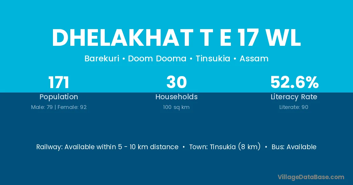Tinsukia (8 km) is the nearest town to Dhelakhat T E 17 Wl village for major economic activities and is located approximately 8 km away.