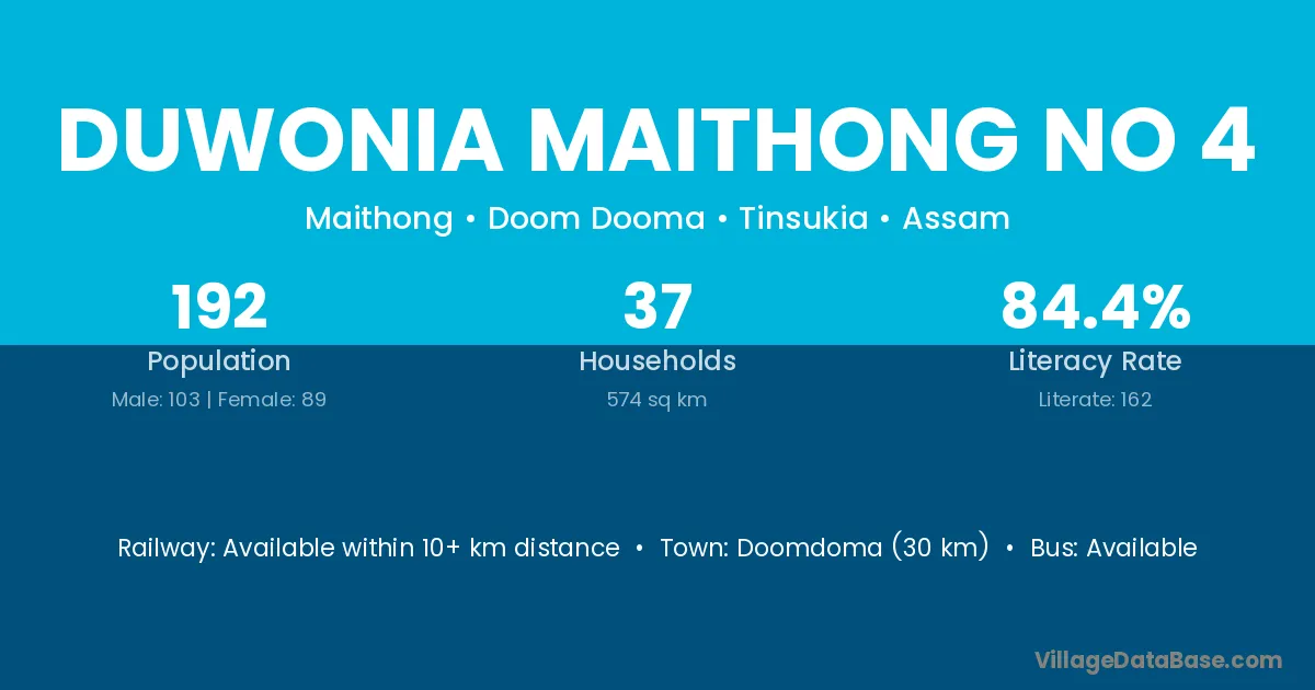 Duwonia Maithong No 4 village has a total population of 192 people, of which 103 are males and 89 are females.
