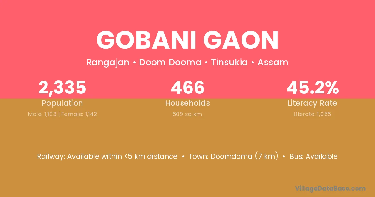 Gobani Gaon village has a total population of 2,335 people, of which 1,193 are males and 1,142 are females.