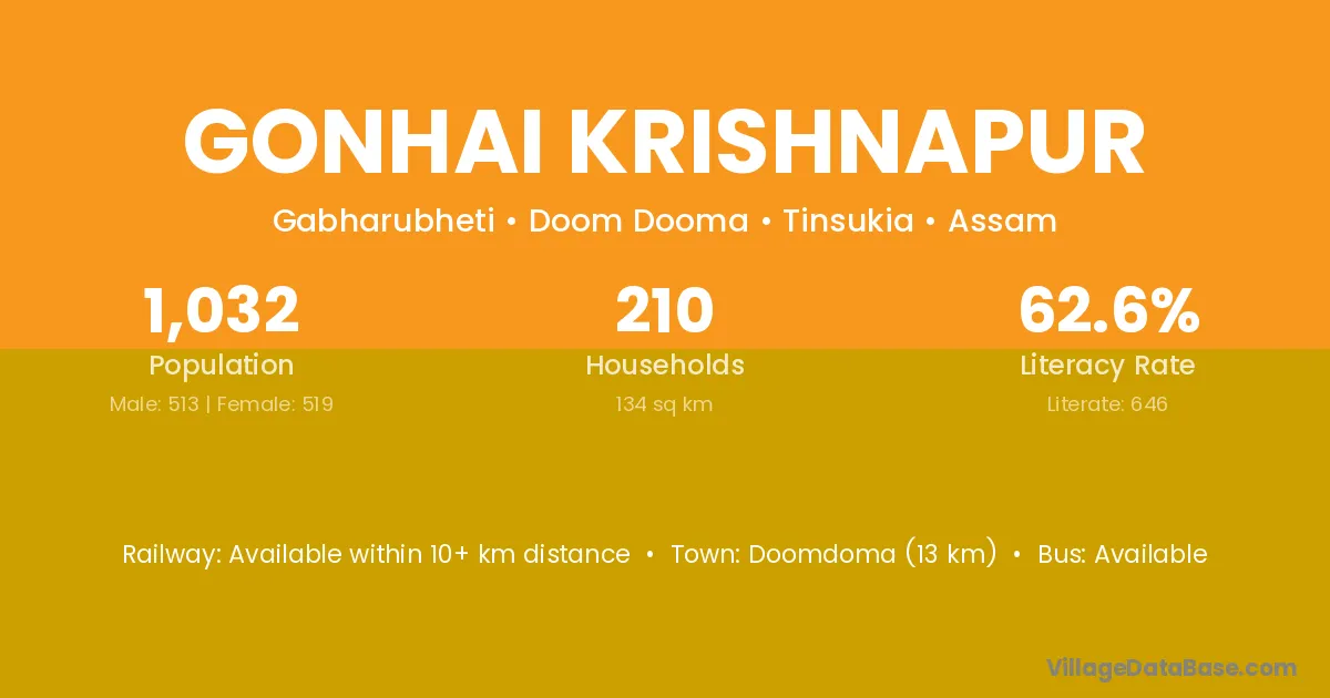 Doomdoma (13 km) is the nearest town to Gonhai Krishnapur village for major economic activities and is located approximately 13 km away.