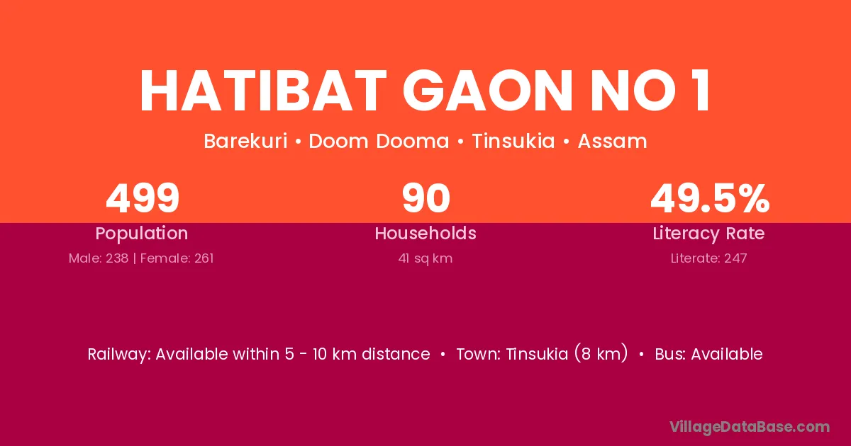 Hatibat Gaon No 1 village has a total population of 499 people, of which 238 are males and 261 are females.